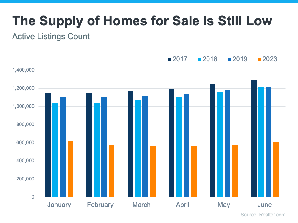 When you compare the orange bars for 2023 with the last normal years for the housing market (2017-2019), you can see the count of active listings is still far below the norm.