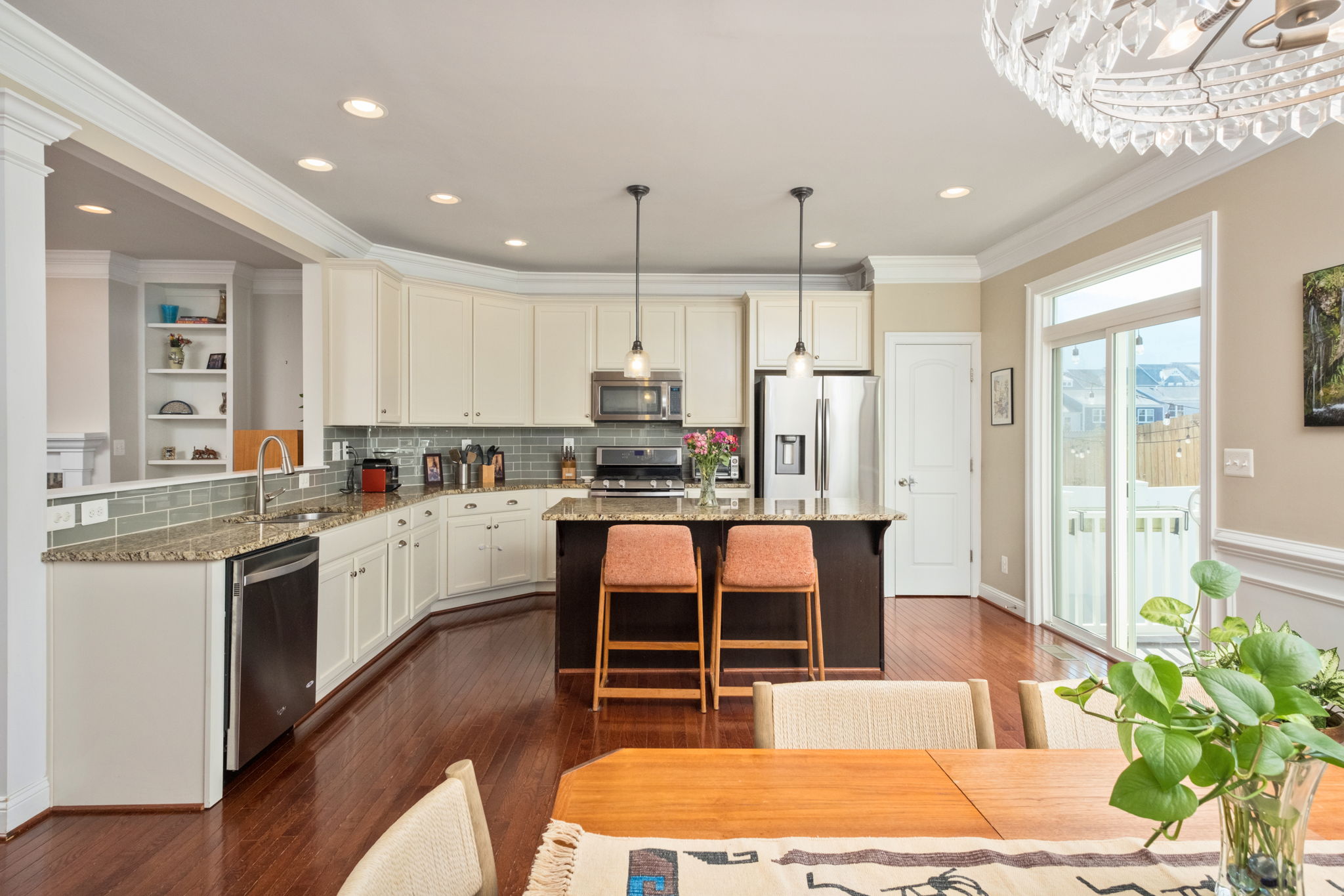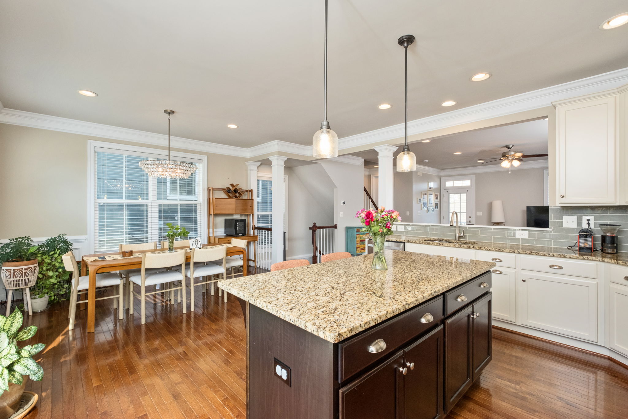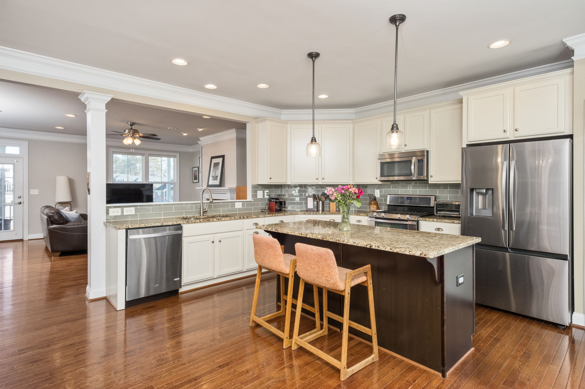 Two additional bedrooms, full bath, and convenient laundry complete the top floor. The main level showcases an open-concept design with hardwood floors, crown molding, gas fireplace, and abundant natural light throughout. The kitchen has tons of cabinet and countertop space plus a gas range ready for the home chef. The entry level includes a private bedroom suite ideal for guests, a home office, or rec room. It’s all capped off with a two-car garage.