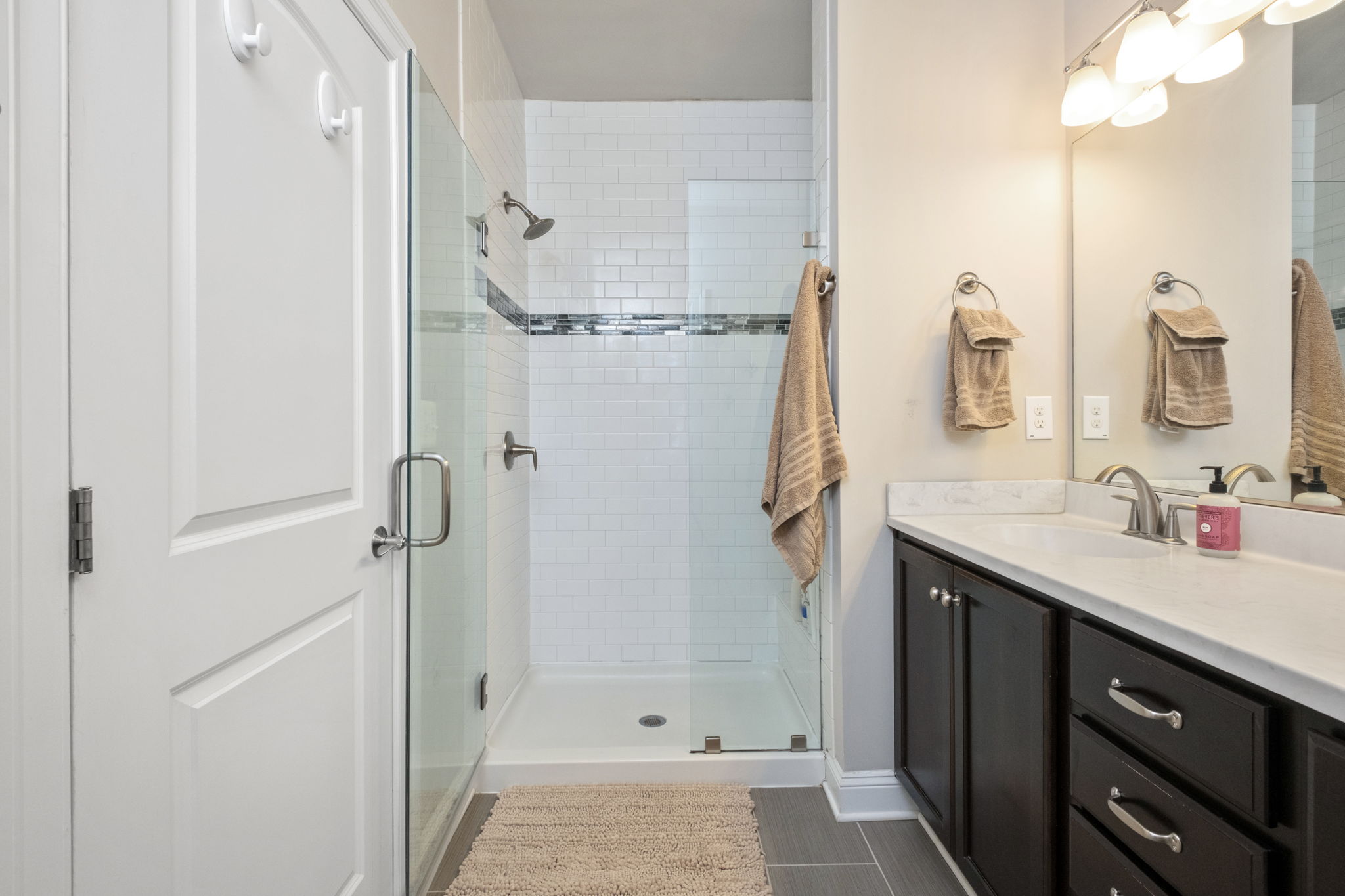 Premium end-unit Avinity townhome offering mountain views, a private balcony, and secluded patio, the perfect blend of scenery and privacy. This spacious four-bedroom layout is designed for comfort and flexibility. Upstairs features a large primary suite with big walk-in closet and attached bath with dual vanities and a large tiled shower.